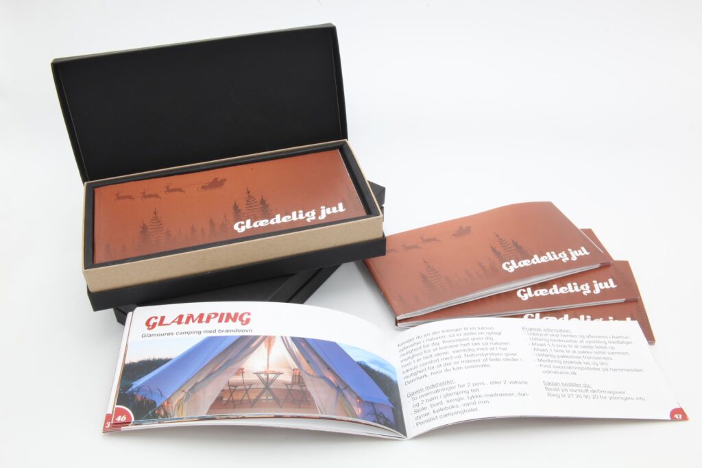 Vi ønsker helst at levere firmajulegaven online, for at undgå mindst mulig tryk af æsker/folder/papir/etc. Men det er muligt, hvis man ønsker at få dem leveret i flotte gaveæsker, hvor oplevelserne bliver præsenteres i en fin lille bog.