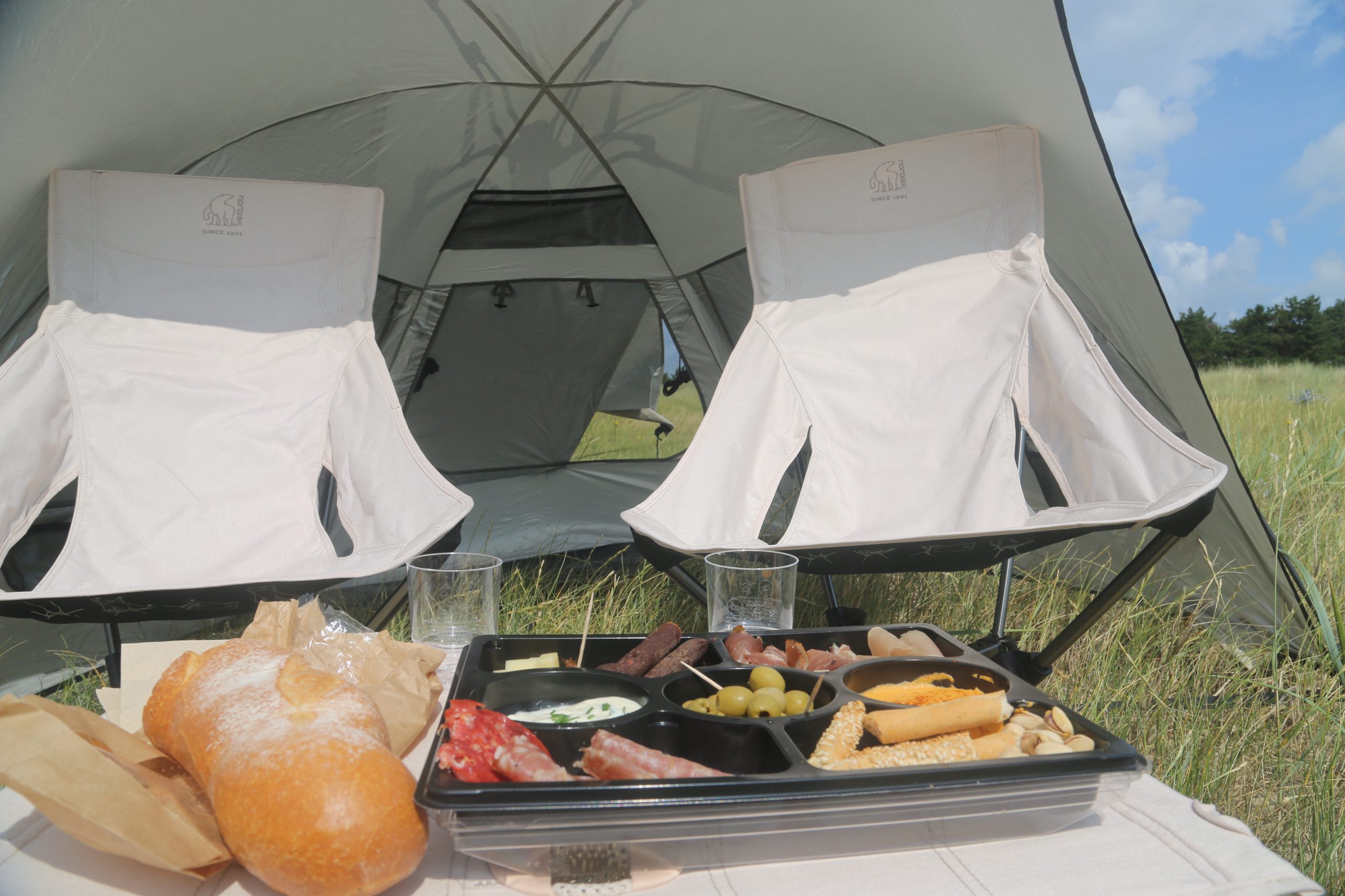 🚲 ALT udstyr er sørget for. luksus læ og skygge telt, komfort stole og bord fra NORDISK,